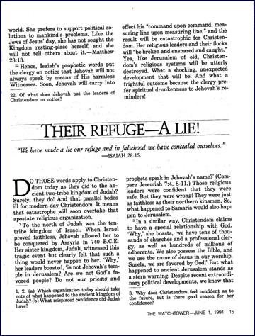Watchtower Magazine, June 1, 1991, p. 17, Their Refuge—A Lie! |
