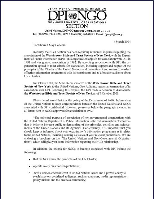 (The UK’s Guardian News publicly exposed the Watchtower Society’s hidden UN-NGO status on Monday, October 8th, 2001 which resulted in the immediate-next day, voluntary withdrawal of the Watchtower Society from UN-DPI Association. See link: http://www.guardian.co.uk/uk_news/story/0,3604,565005,00.html ) |