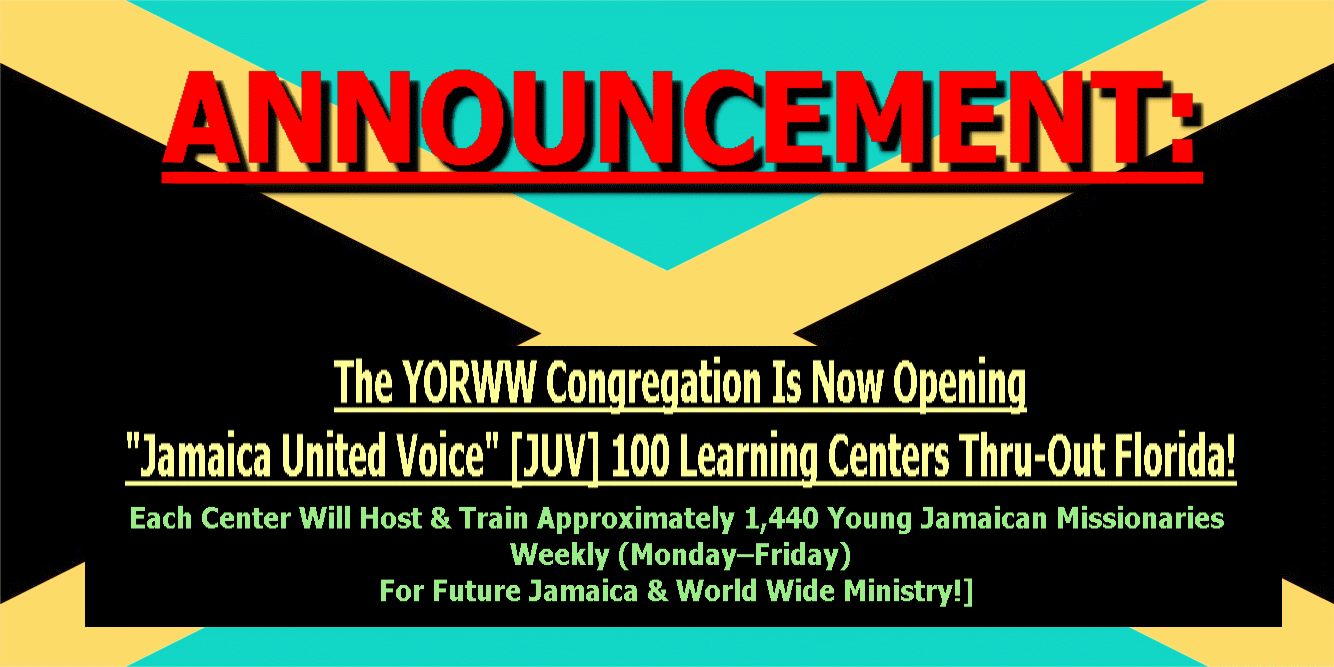Yes, the YORWW Congregation is preparing to launch a new initiative called the “New Outreach Jamaican Ministry (For Young Missionaries)” in North Florida, as mentioned on their contact page. This effort appears to be part of their broader mission to establish Jamaica as the New Spiritual Nation Chosen by God. -- See Exodus 19:5-6; Deuteronomy 7:6; Revelation 14:1-5. |